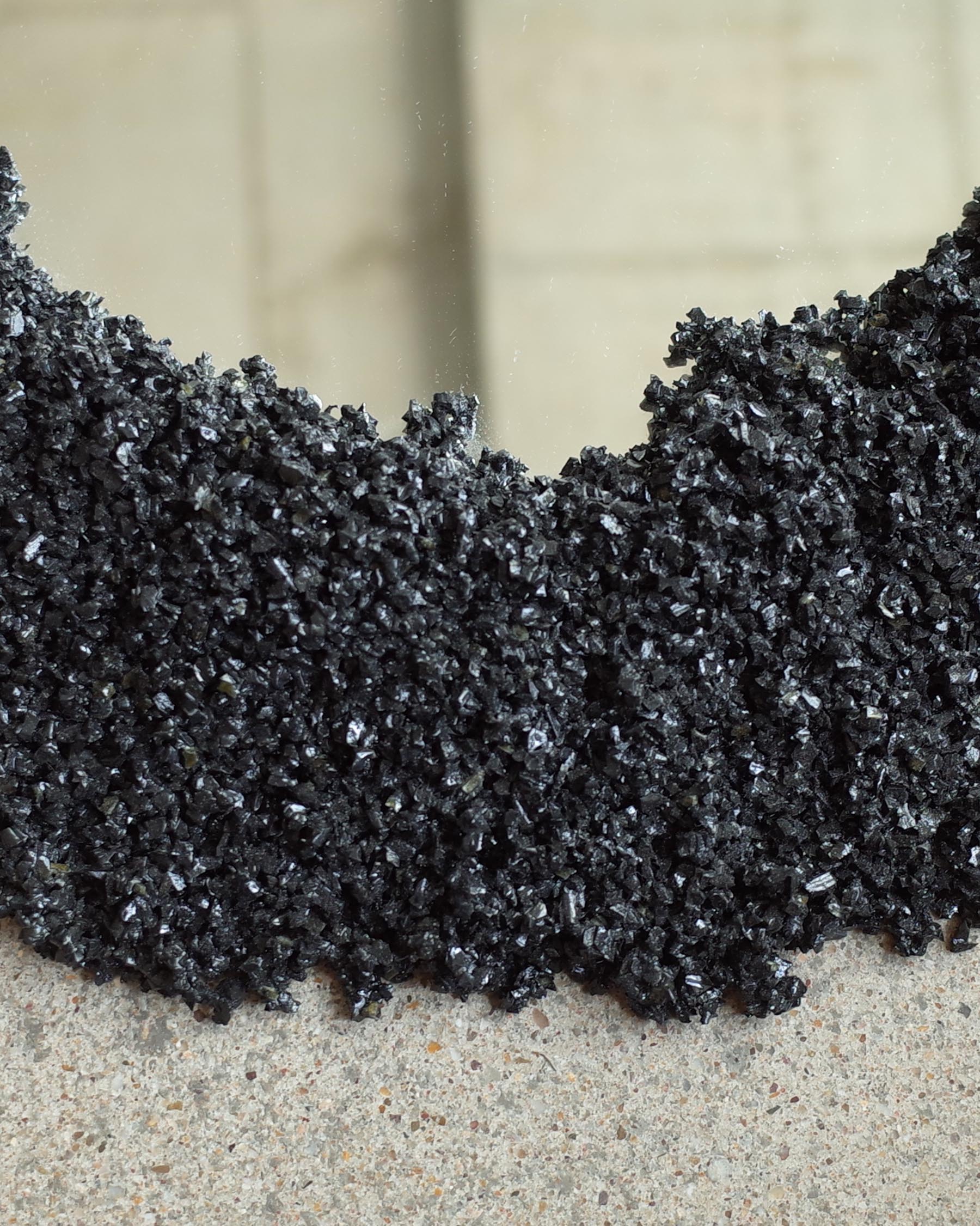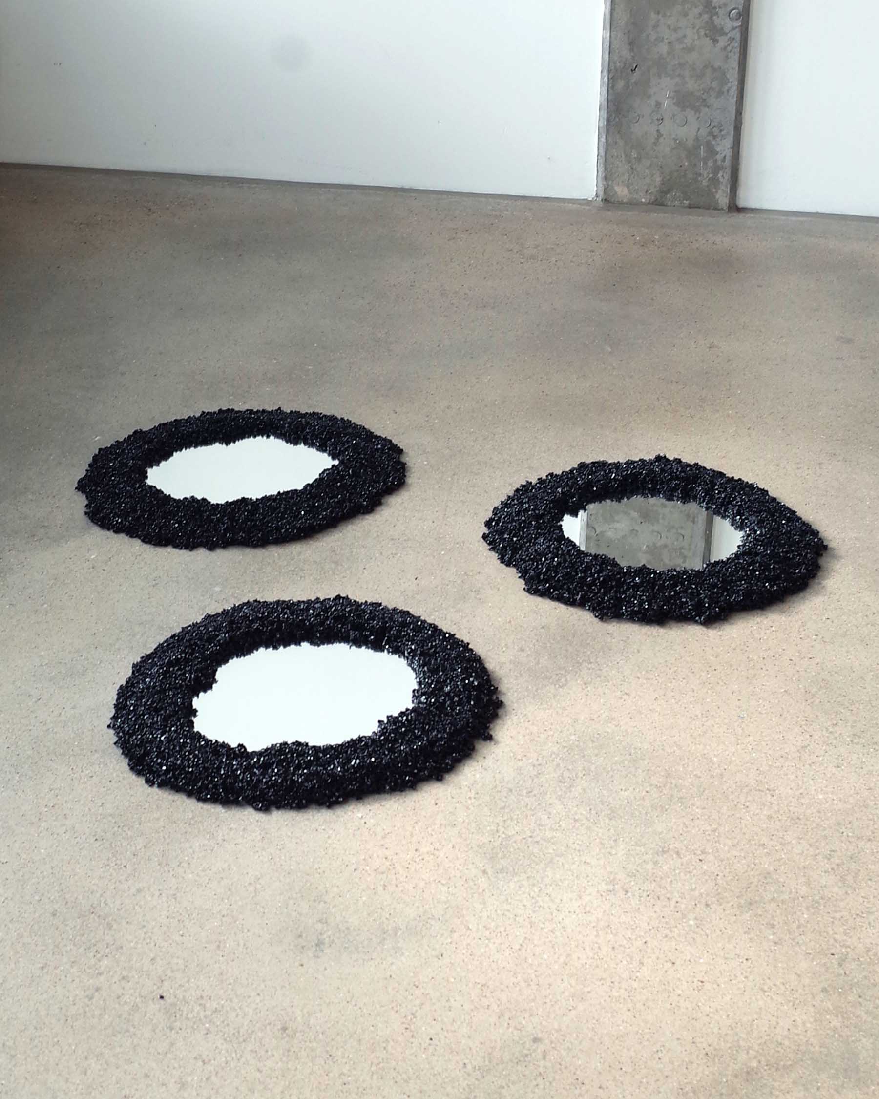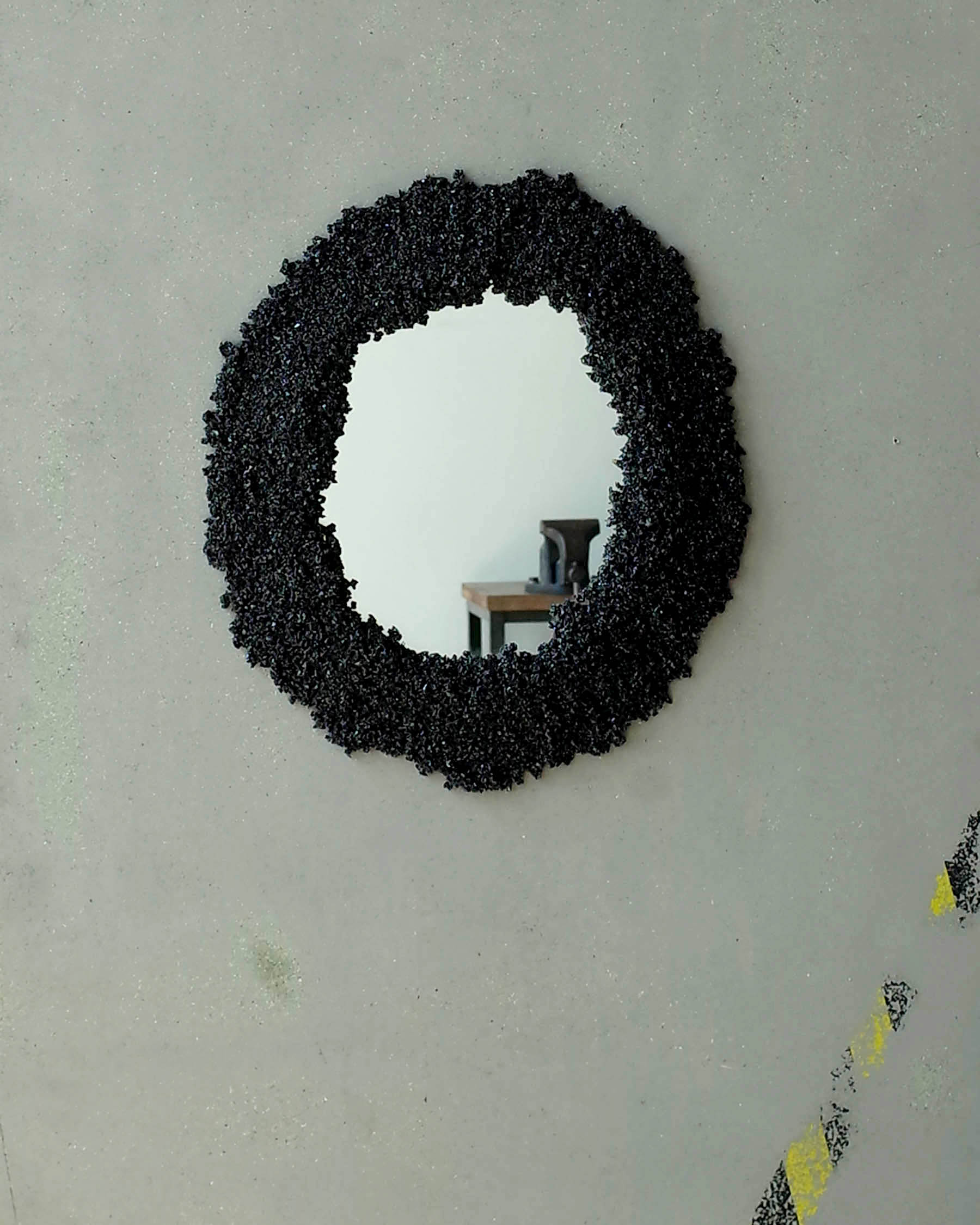 The Rubber Mirror is a unique product created by hand in the studio. It is made from rubber granules that are normally used for playgrounds. This mirror can fulfill its purpose in hallways as a tool for the last check before heading out the door or as a sculpture-like wall object adding texture and an irregular edge.